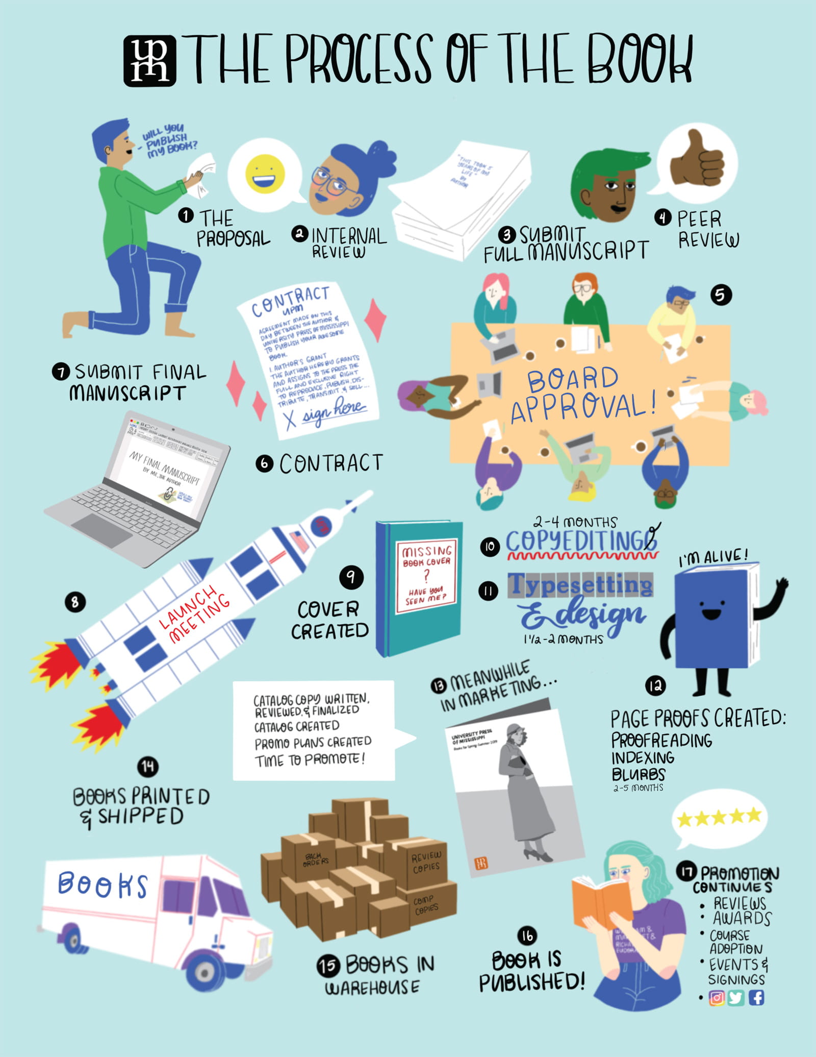 This page introduces you to University Press of Mississippi’s publishing procedures. The following infographic illustrates our typical publication process. Like all of our books, the process for each project will be unique in some ways.